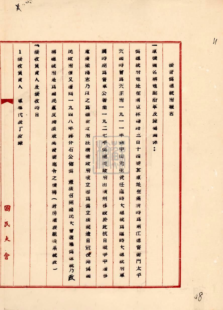 內(nèi)容與評價:1949年4月23日,南京解放,南京城實行軍事管制。軍管會政務接管委員會派出軍代表接管國民黨政府的各級機構(gòu),并在接管后完成詳細的接管報告。這份寫于1949年11月的《接管偽總統(tǒng)府工作報告》,主要有六方面的內(nèi)容:一原機構(gòu)名稱地點沿革及隸屬關(guān)系,二接收負責人和接收時間,三接收經(jīng)過,四處理經(jīng)過,五現(xiàn)時情況,六主要經(jīng)驗教訓,并附偽總統(tǒng)府組織系統(tǒng)表等詳細內(nèi)容。