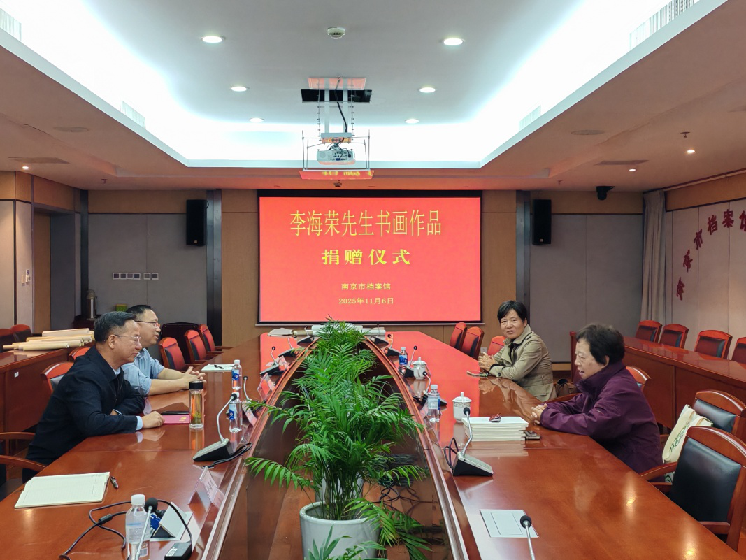 11月6日,南京市檔案館舉行中國書法家協會會員,南京市文聯原副主席及黨組副書記李海榮先生書畫作品捐贈儀式。李海榮先生的夫人徐學群女士向南京市檔案館捐贈62件書畫作品。南京市檔案館副館長王長喜接受捐贈并向徐學群女士頒發捐贈證書。